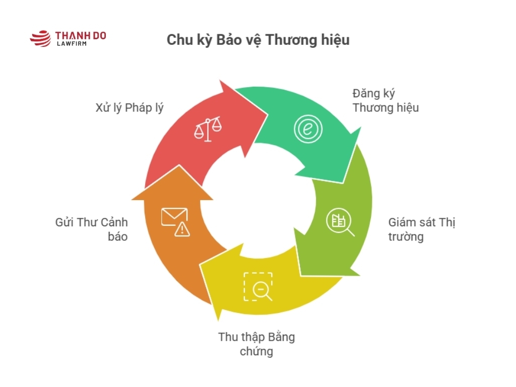 Quy trình xử lý vi phạm quyền thương hiệu bao gồm các bước từ thu thập bằng chứng, yêu cầu chấm dứt vi phạm đến khởi kiện dân sự hoặc hình sự, tùy thuộc vào mức độ và tính chất của hành vi xâm phạm.