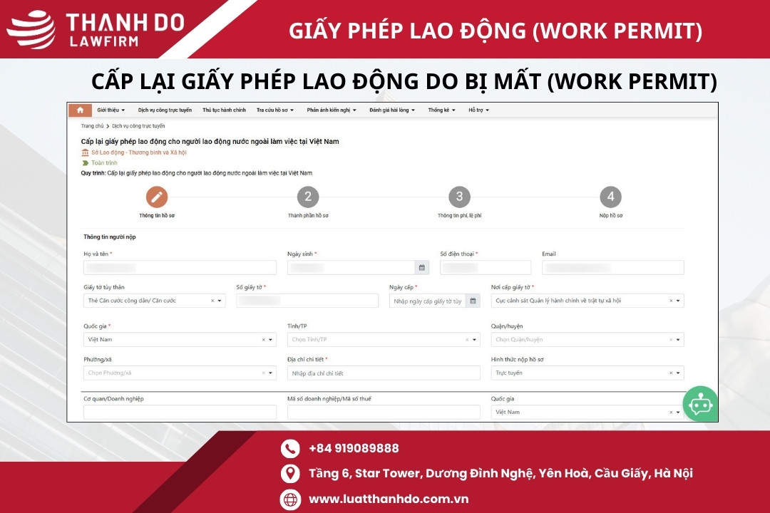 Tìm hiểu chi tiết cách thức nộp hồ sơ xin giấy phép lao động trực tuyến trên Cổng dịch vụ công cấp Tỉnh/Thành phố: https://luatthanhdo.com.vn/giay-phep-lao-dong-cho-nguoi-nuoc-ngoai