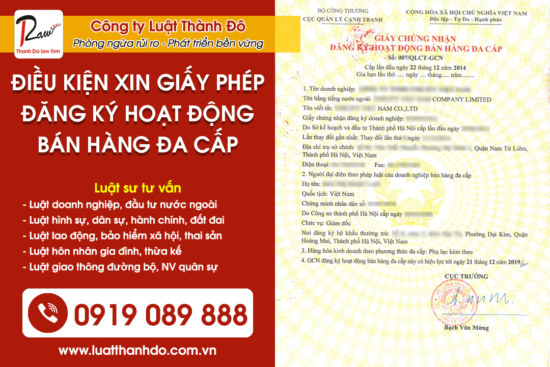 Trên đây là toàn bộ tư vấn của chúng tôi về điều kiện xin cấp giấy chứng nhận đăng ký hoạt động bán hàng đa cấp dành cho quý doanh nghiệp. Quý doanh nghiệp có thể tham khảo thêm các bài viết về hoạt động bán hàng đa cấp tại chuyên mục tư vấn giấy phép của Luật Thành Đô để tìm hiểu thêm về hoạt động quản lý và cấp phép bán hàng đa cấp. Trong trường hợp cần tư vấn chi tiết về thủ tục xin giấy phép hoạt động bán hàng đa cấp hoặc có nhu cầu sử dụng dịch vụ xin giấy phép bán hàng đa cấp, quý doanh nghiệp vui lòng liên hệ với Công ty Luật Thành Đô để được tư vấn và báo giá.