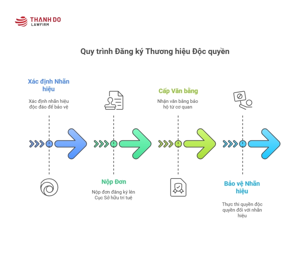 Quy trình đăng ký thương hiệu độc quyền bao gồm 5 bước chính: Tra cứu, Chuẩn bị hồ sơ, Nộp đơn, Thẩm định (hình thức và nội dung) và Cấp Văn bằng bảo hộ, kéo dài từ 15-18 tháng.