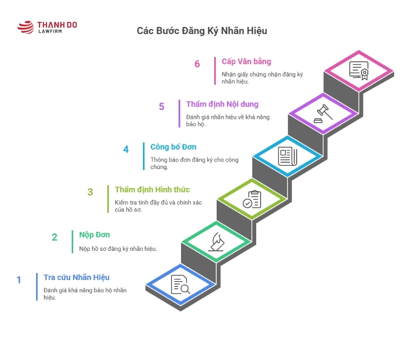 Quy trình đăng ký nhãn hiệu bao gồm tra cứu, nộp đơn, thẩm định hình thức, công bố đơn, thẩm định nội dung và cấp văn bằng bảo hộ.