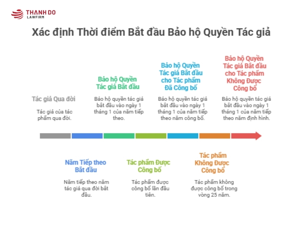 - Đối với các tác phẩm được bảo hộ suốt cuộc đời tác giả và 50 năm tiếp theo năm tác giả qua đời (như tác phẩm văn học, khoa học, âm nhạc, sân khấu, kiến trúc, v.v.), thời hạn bảo hộ bắt đầu tính từ ngày 01 tháng 01 của năm tiếp theo năm tác giả cuối cùng qua đời. Nếu là tác phẩm đồng tác giả, thời điểm này được tính từ ngày 01 tháng 01 của năm tiếp theo năm tác giả cuối cùng trong số các đồng tác giả qua đời.