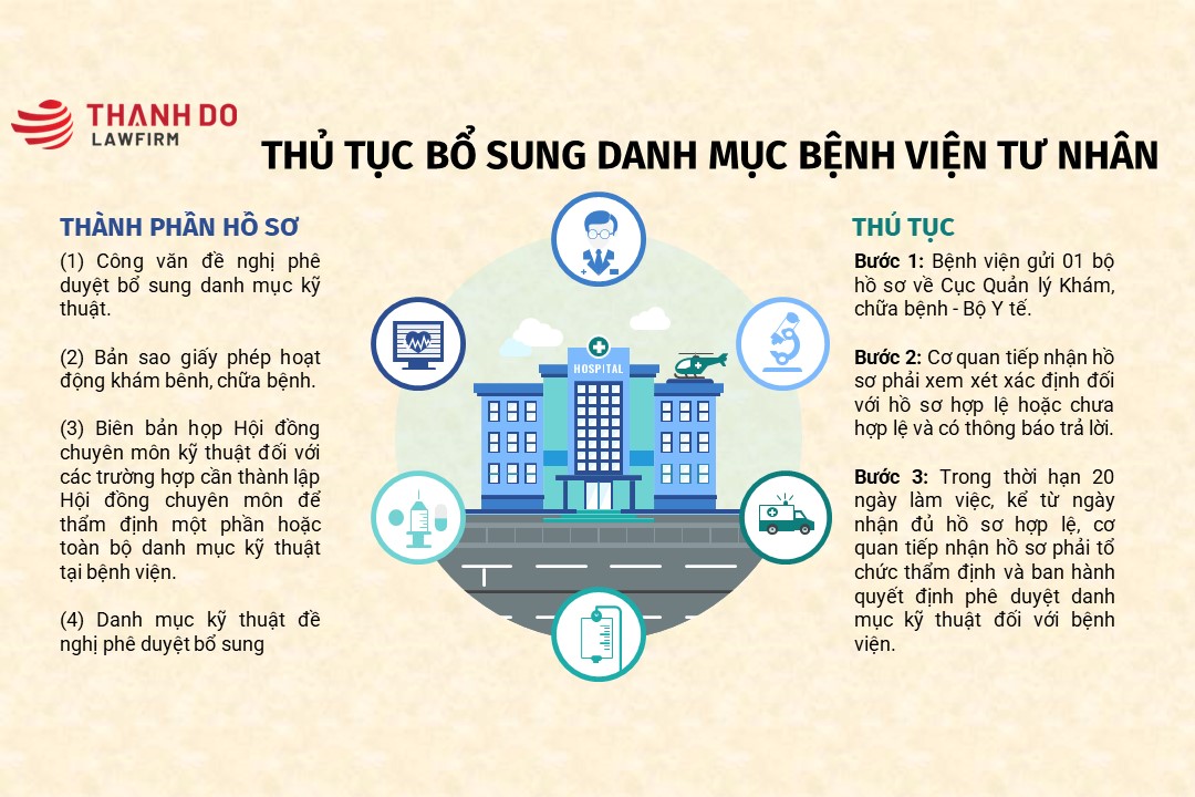 Việc bổ sung danh mục kỹ thuật bệnh viện tư nhân là một trong những thủ tục quan trọng khi bệnh viện đã được cấp giấy phép hoạt động bệnh viện (giấy phép hoạt động khám bệnh, chữa bệnh) và đề nghị phê duyệt danh mục kỹ thuật do thay đổi phạm vi hoạt động chuyên môn. Luật Thành Đô sẽ cung cấp những thông tin về thành phần hồ sơ, trình tự thực hiện, cơ quan có thẩm quyền, thời gian và lệ phí thực hiện thủ tục bổ sung danh mục kỹ thuật đối với bệnh viện tư nhân.
