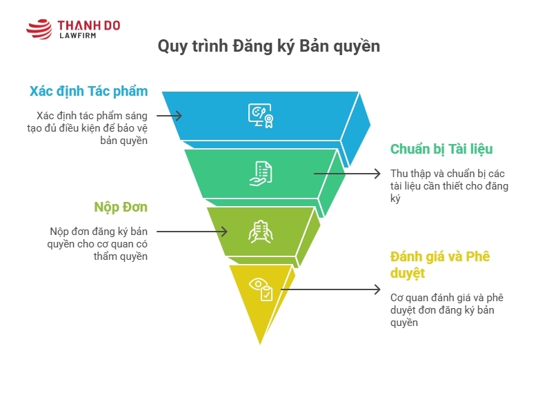 Quy trình đăng ký bản quyền sản phẩm tại Việt Nam bao gồm các bước nộp hồ sơ đầy đủ tại Cục Bản quyền tác giả, thẩm định hình thức, thẩm định nội dung, và cấp Giấy chứng nhận đăng ký quyền tác giả, thường mất khoảng 15 ngày làm việc nếu hồ sơ hợp lệ.