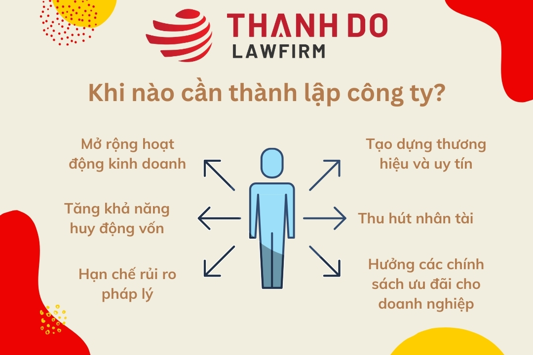 Khi hoạt động kinh doanh ngày càng phát triển, cần thiết phải huy động thêm nguồn lực và tổ chức lại mô hình quản lý thì việc thành lập công ty sẽ các cá nhân/tổ chức hợp pháp hóa hoạt động kinh doanh của doanh nghiệp. Từ đó thu hút thêm các nhà đầu tư và huy động vốn từ nhiều nguồn khác nhau, dễ dàng mở rộng cơ hội kinh doanh.