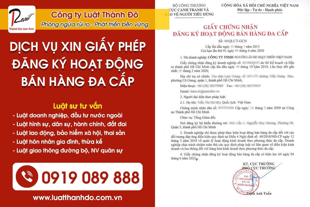 Luật Thành Đô tự hào là đơn vị đã có nhiều năm kinh nghiệm trong lĩnh vực tư vấn và xin cấp giấy chứng nhận đăng ký hoạt động bán hàng đa cấp cho các doanh nghiệp hoạt động bán hàng đa cấp hàng đầu tại Việt Nam hiện nay.