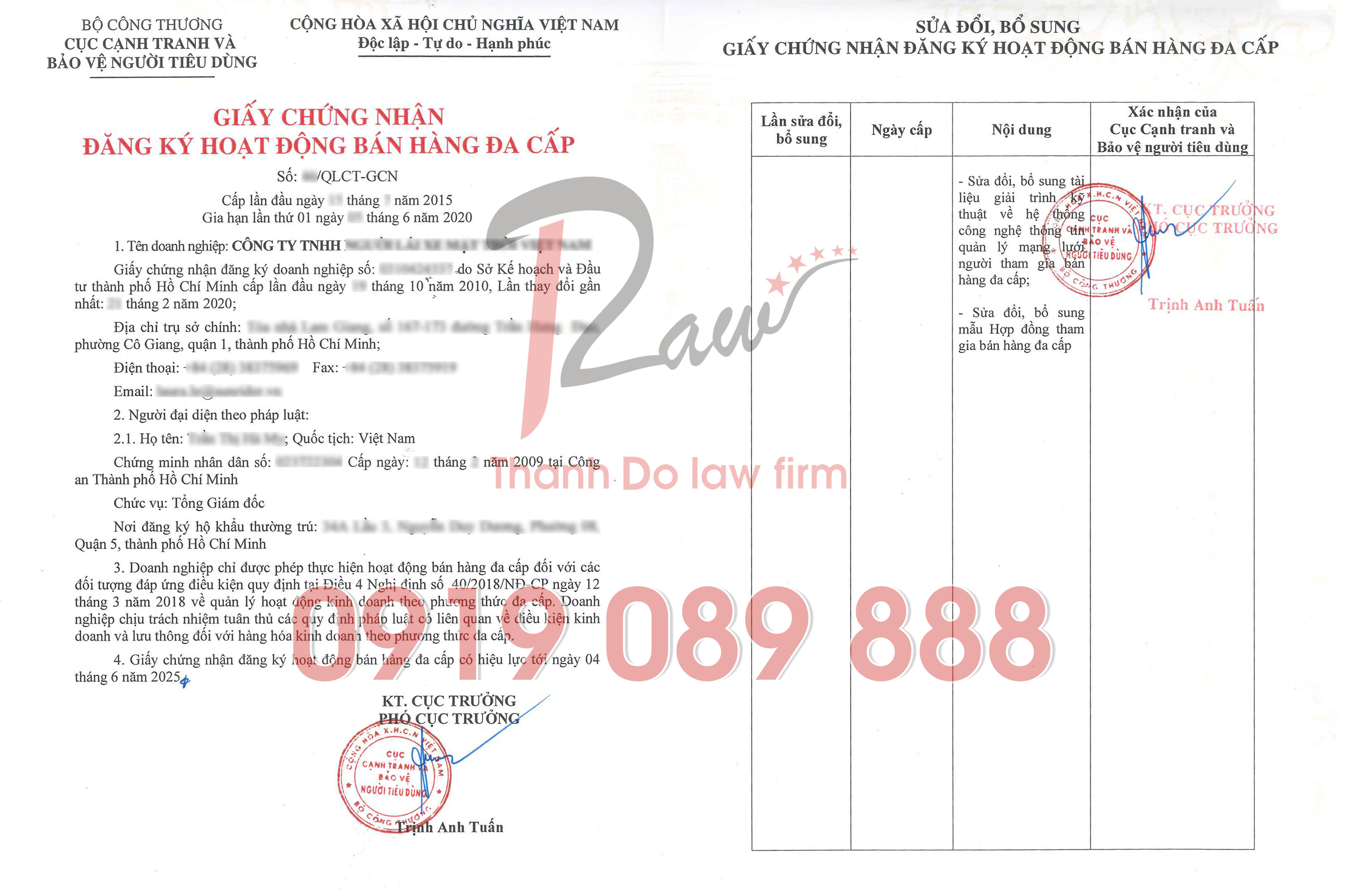 Sau khi có kết quả và hoàn tất quá trình xin cấp giấy phép hoạt động bán hàng đa cấp tại cơ quan chức năng, Luật Thành Đô đại diện doanh nghiệp nhận Giấy chứng nhận và trao doanh nghiệp hoạt động bán hàng đa cấp;