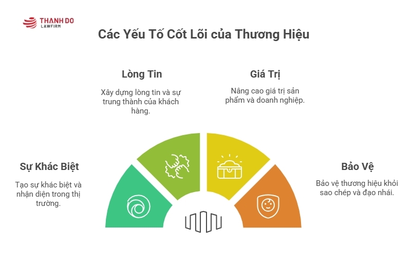 | Đối tượng bảo hộ | Không phải đối tượng được bảo hộ trực tiếp bởi pháp luật SHTT Việt Nam. Các thành tố của nó (nhãn hiệu, kiểu dáng, tác phẩm) được bảo hộ. | Tên, logo, khẩu hiệu, hình ảnh, hình 3D, âm thanh dùng cho sản phẩm/dịch vụ. | Tên giao dịch của doanh nghiệp, tên công ty. |